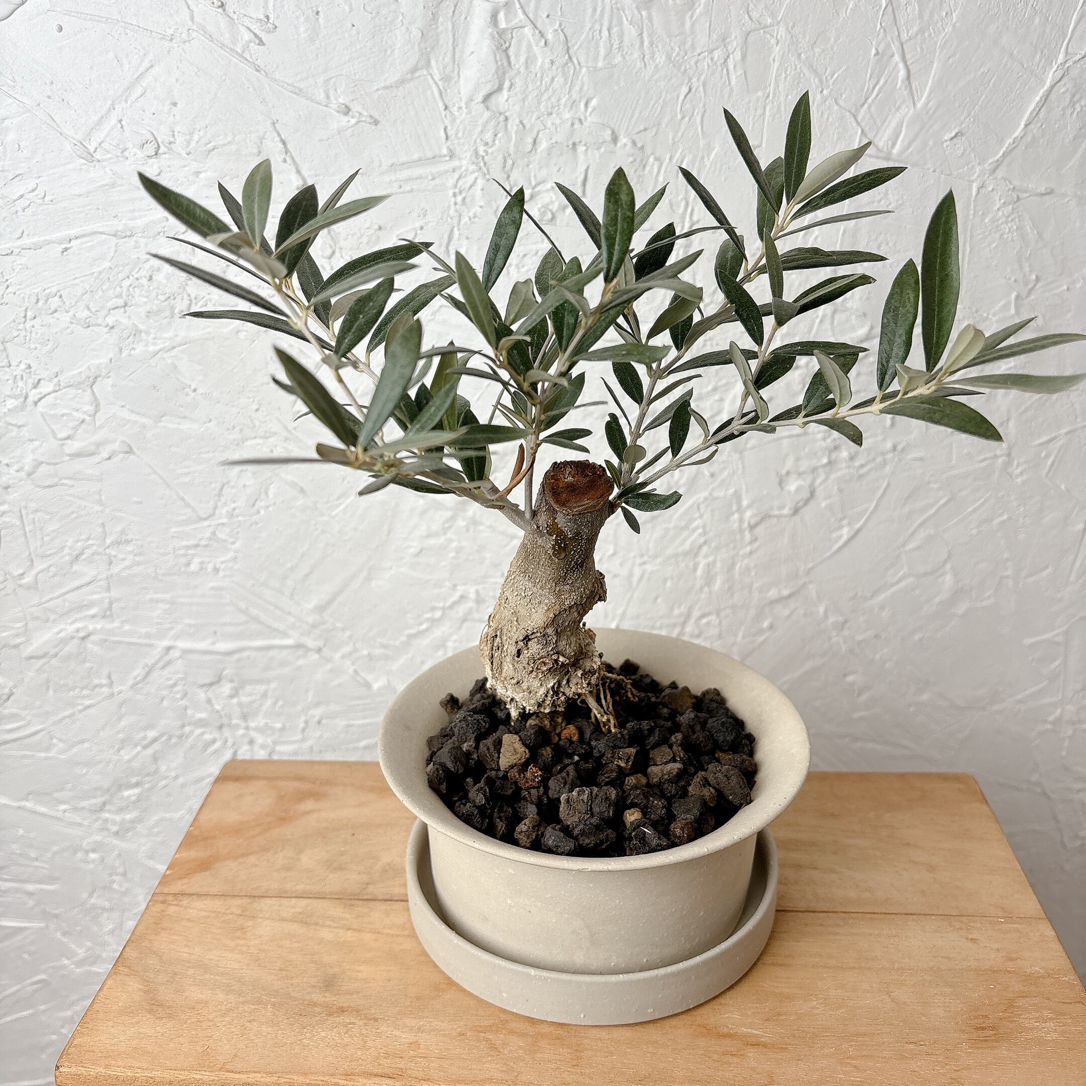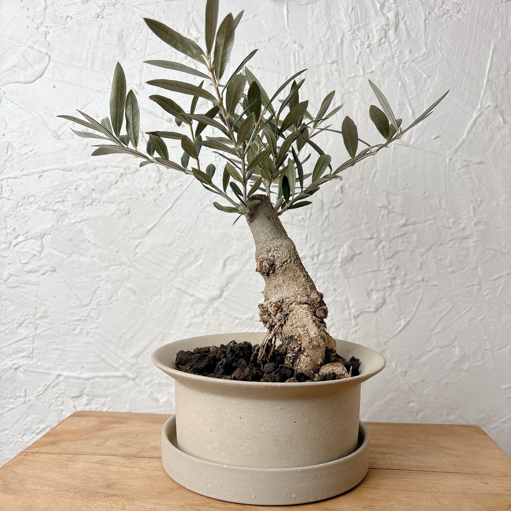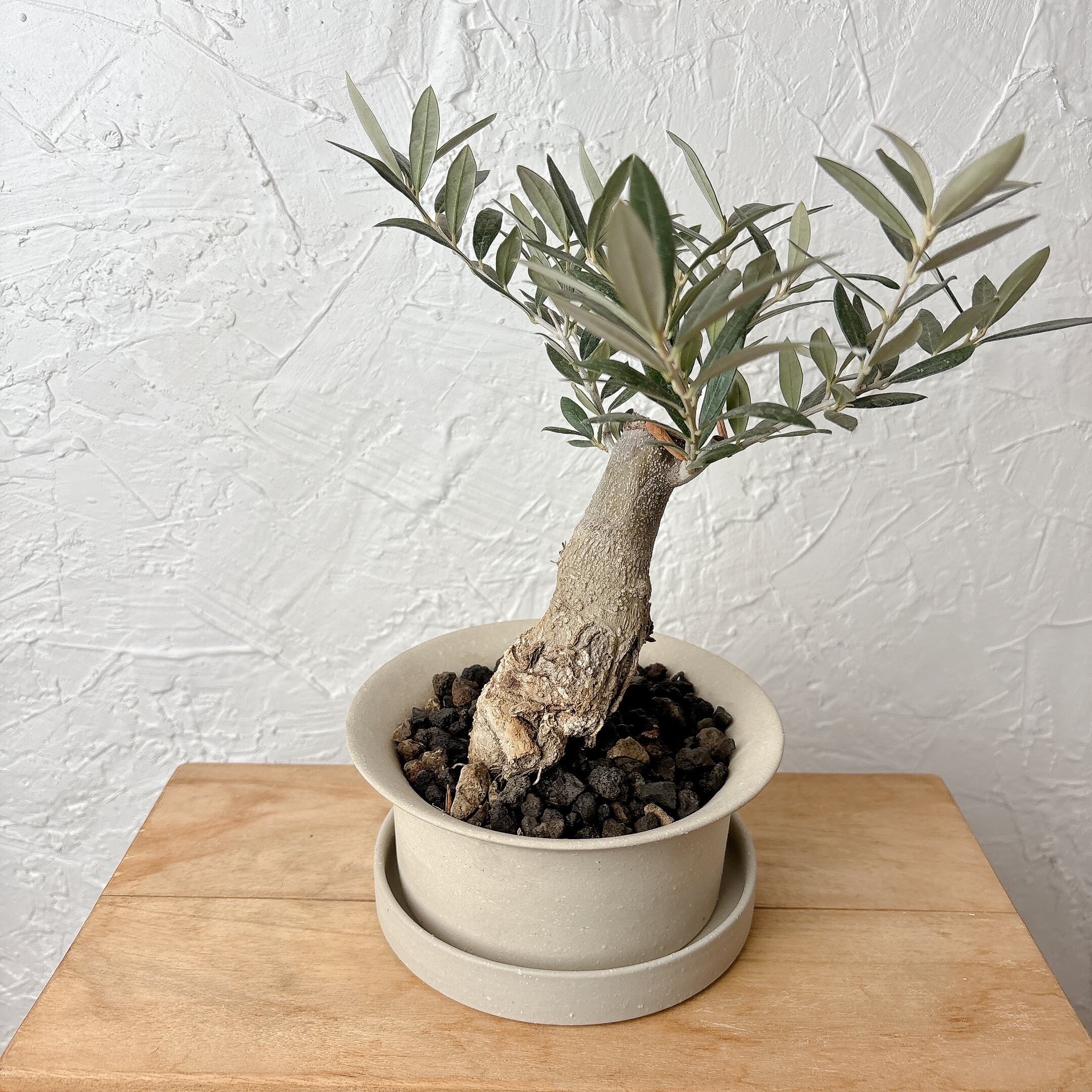 盆栽イメージの浅型で、オリーブの幹に近い色味の陶器鉢を合わせました