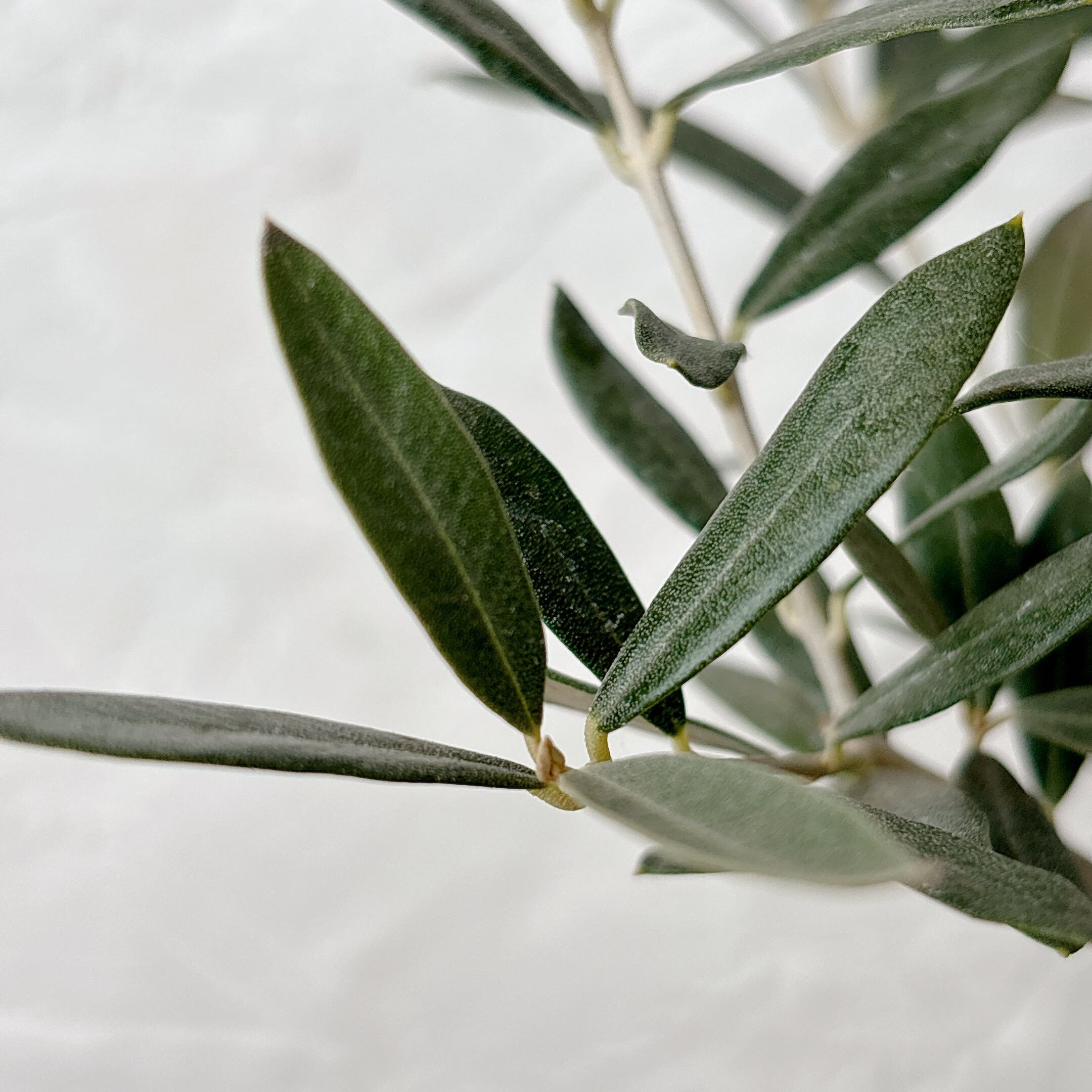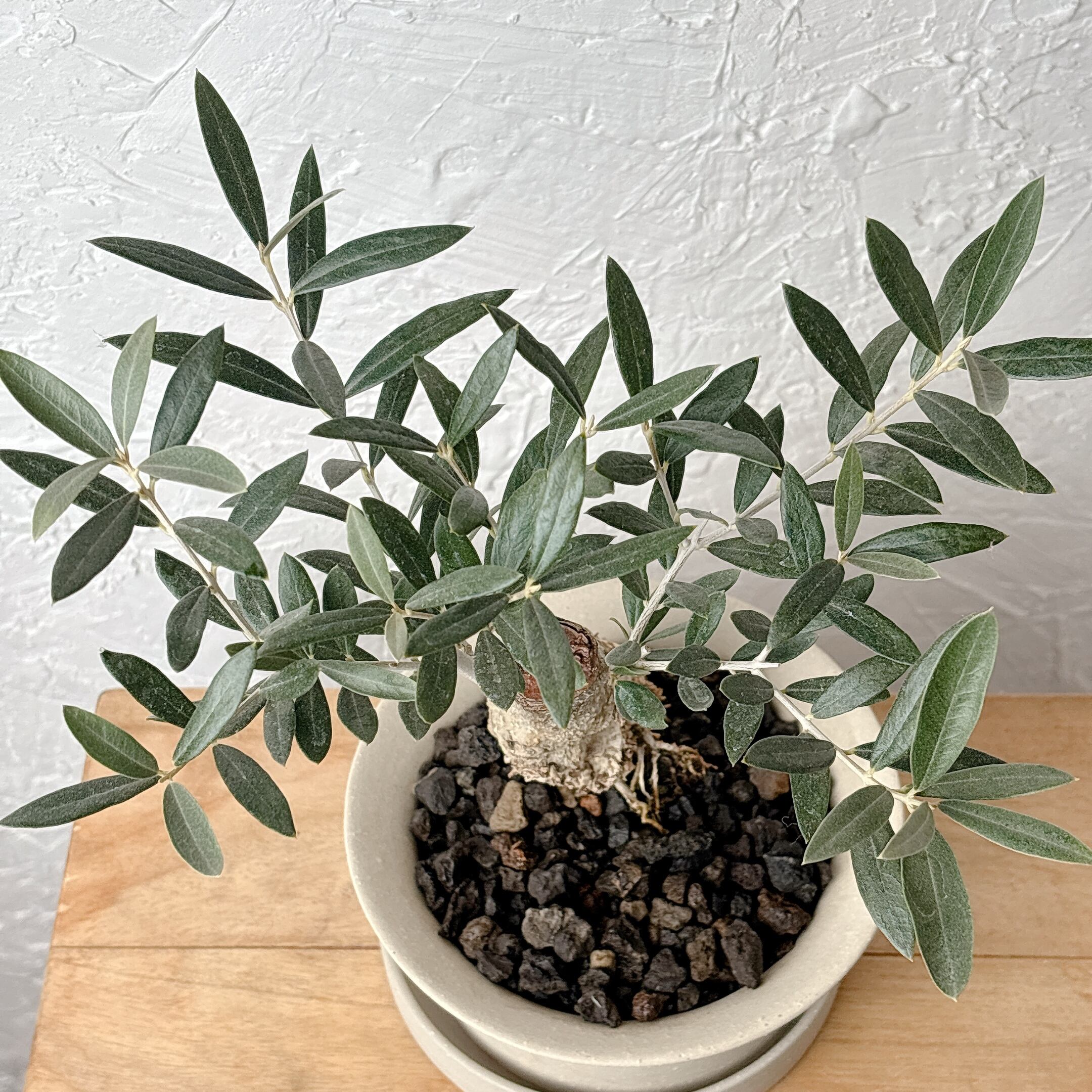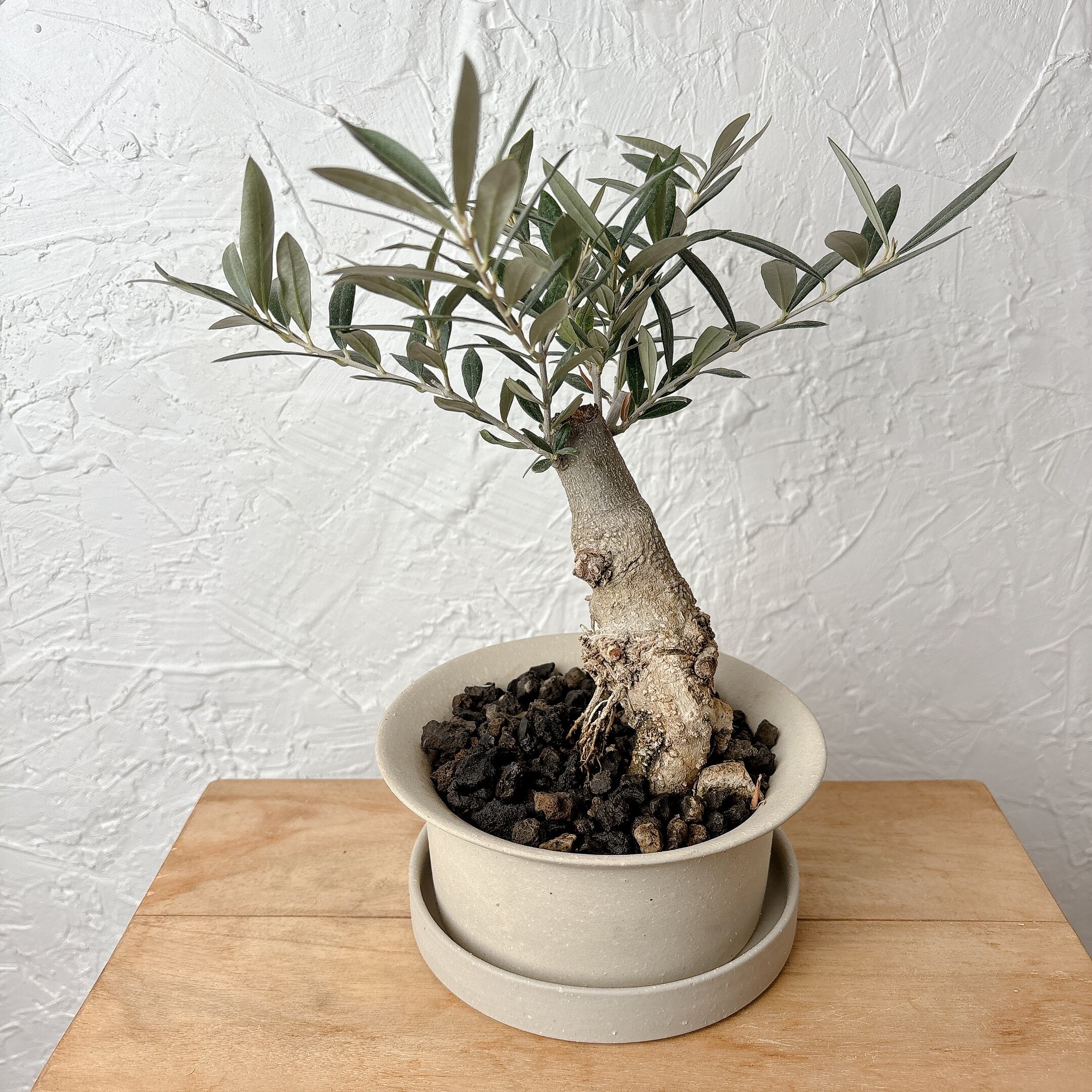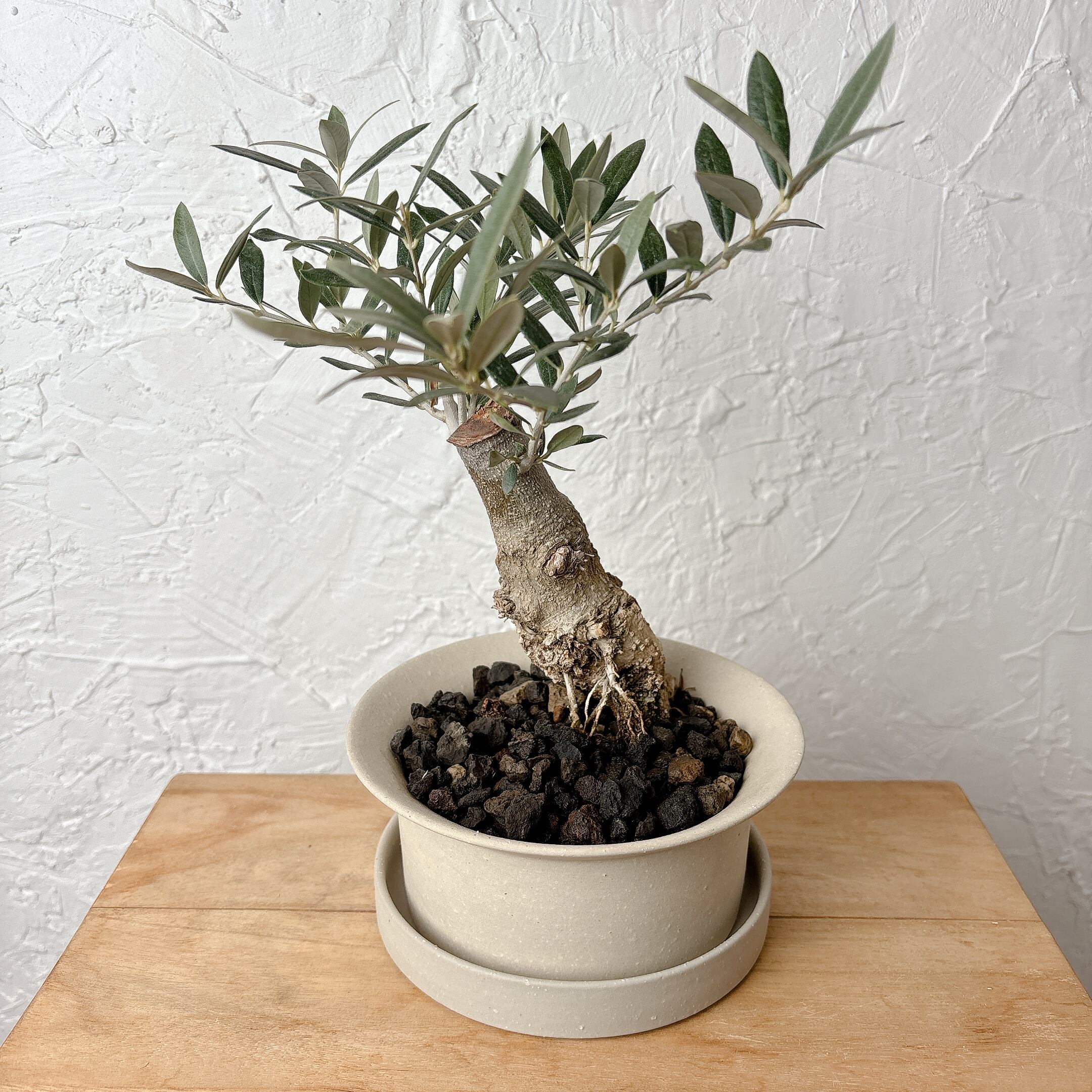盆栽イメージの浅型で、オリーブの幹に近い色味の陶器鉢を合わせました